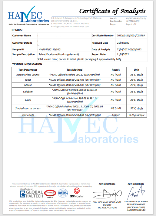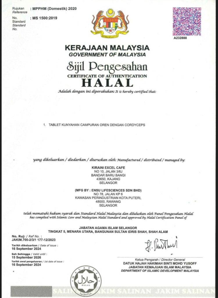 Majlis Fatwa kebangsaan telah menyatakan hukum memakan Cordyceps adalah harus dalam rawatan tradisional dan Excel care merupakan syarikat 100% milik bumiputera islam. dan produk ni dibawah naungan Dato’ Dr Fadzilah Kamsah. pakar motivasi terkemuka negara.